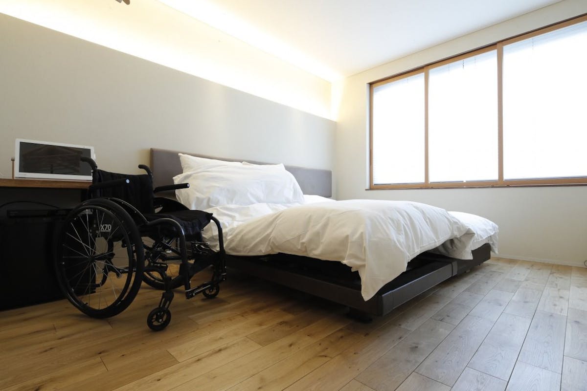 通路幅の確保されたベッドルームと、客室入り口のスロープ▼