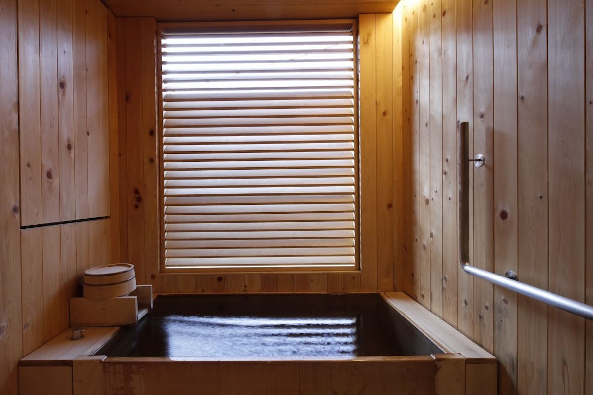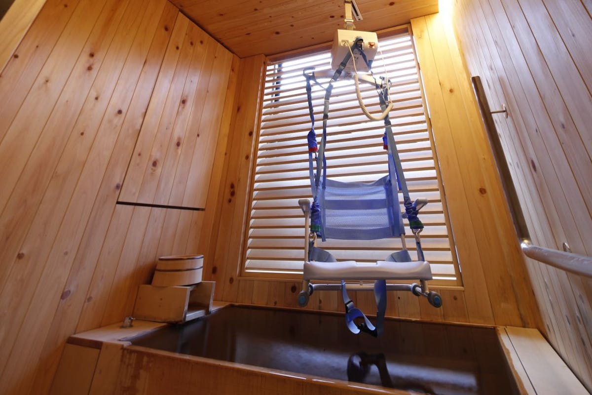 介助する方にも、される方にも使いやすいリフト設置の貸切風呂『はるの湯』。障害をお持ちの方と介助の方は1時間無料で利用できます。
