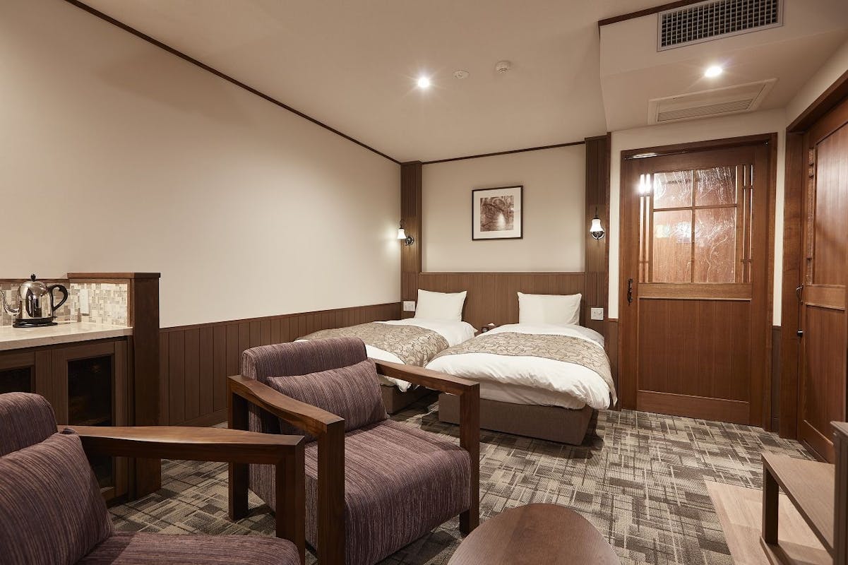 電動ベッドありのツインルームと、リビングスペース付きツインルームの2ルームを備えた二世代利用を想定した客室です。