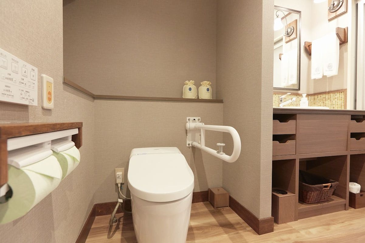 シャワーチェアの貸出しもあり(左) 共用の多目的トイレもあります(右)▼
